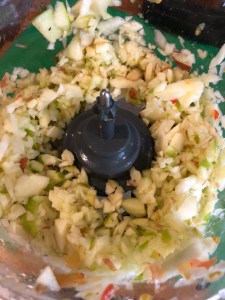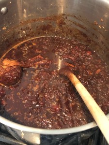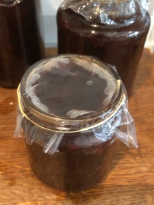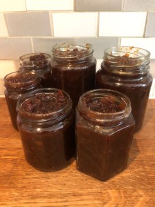This will take a long time so just let it simmer away. Depending how much liquid the fruit and veg contained it may take even longer. Stir occasionally. The liquid will evaporate off and you will be left with a thicker consistency (chutney like!) – when you draw a spoon through it will leave a trail.