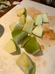 Peel and chop the onions into quarters. Core and chop the apples into quarters or eighths if large, leave the peel on. Chop the tomatoes.