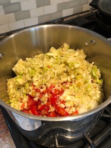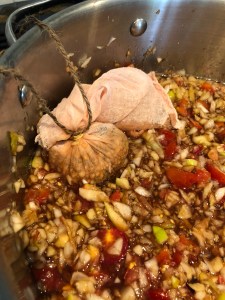 Place into a very large saucepan. Crush the garlic cloves and add them too. Stir well.