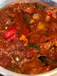If using fresh veg then prepare it and chop it up. Heat a little oil in a pan, add onions first and allow to soften. Chop the sausages in to slices and add to the pan and allow to brown. Then add the pepper, courgette and aubergine (if using a pack then just throw it all in at once once the sausages have browned).