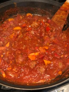Add the no-meat meat balls to the pan allow to brown. Then add the mushrooms and any other veg you’re using. Be gentle with the mixture as otherwise the meatballs will break up.