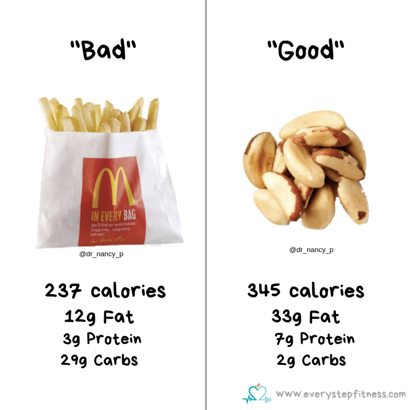 So if your goal was fat loss and you decided to just replace those fries you have every Saturday afternoon with the Brazil nuts because they’re ‘good’ you’d actually be consuming more calories. Thereby not helping your goal.