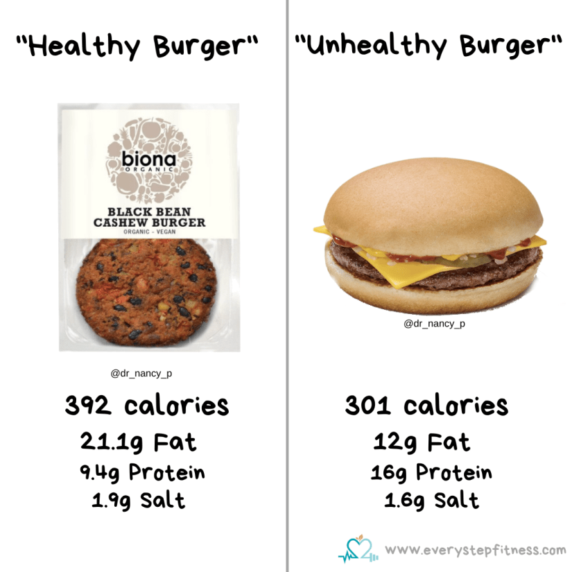 So if you needed a quick lunch, and really fancied a cheeseburger, you’d be far better off just having one. I’m certainly not suggesting your whole diet be made up of “junk food”, but it’s important to be wary of these marketing ploys which make you perceive things as being “healthy” and therefore lower calorie and helpful for weight loss. At the end of the day, as always, it comes down to calories. If you want to lose fat or weight, then you need to be at a calorie deficit. And it’s important to still have foods you enjoy as part of an overall balanced diet. So have the cheeseburger for lunch if you want it, and then have a dinner with a range of whole foods and vegetables etc.