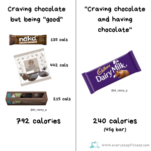 However you’ve consumed over 700 cals in that little exercise… Instead you could have had a 45g sized bar of actual chocolate – enjoyed it, fed the craving and got on with your day for a mere 240 cals. In fact you could have had 2 bars and still have consumed fewer calories!