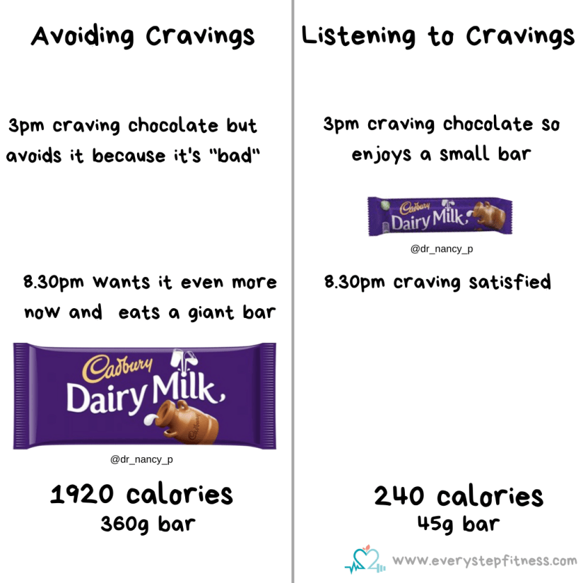 Chances are that in most cases if you enjoy that chocolate for your snack, factor it into your day’s calories, then you won’t feel the need to inhale a giant bar later that day. So instead of ending up gorging on 1920 cals of chocolate you will have had 240 cals of it when you wanted it.
