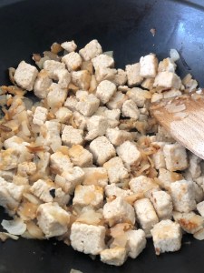 Chop the veggie bacon into small pieces and add to the pan, allowing that to brown too.