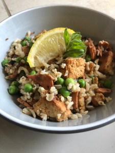 This works well with either freshly cooked or leftover rice. The lemon gives it a real freshness which is great for a warm spring/summer dinner or lunch.
