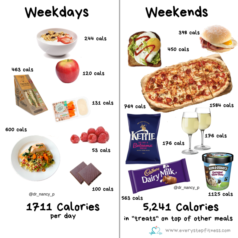You may think that if you stick to your fat-loss calorie target for most of the time (5 days a week) that it’s ok to just relax at the weekend. Now sometimes this can work, but it rather depends how much you relax lol! In this example I’ve assumed a daily calorie goal of 1,800 cals for fat loss, or 12,600 calories per week. So Monday to Friday you hit those calories, or perhaps are even a little under (8,555 cals during the week in this example). Then on Saturday and Sunday you ā€œrelaxā€ and have a few ā€œtreatsā€, because it’s the weekend right? You’ve been good all week so it’s fine… In this example I’ve included two weekend breakfasts, a pizza one night, a couple of glasses of wine, some crisps in front of a movie, sunday evening ice cream and chocolate etc. That’s 5,241 calories and doesn’t even include a full weekend of eating and drinking (especially if you start on Friday evening.. or even Thursday). Just those treats on top of the weekday calories take you to 13,796 calories for the week. So you’re already over by nearly 1,200 cals.