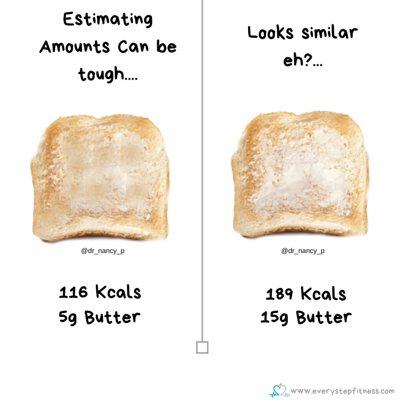 In this example on the left is 5g butter on an 80 cal slice of white toast, on the right is the same toast with 15g butter!