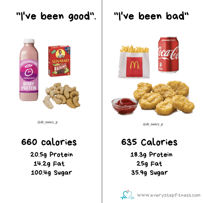 Now I’m not suggesting a Mcdonalds is a “healthy” option, nor am I suggesting it’s got more nutritional benefits than the fruit and nuts. They’re both very different nutritionally, and they both taste very different too. But for many people trying to lose fat or weight they might naturally assume that the McDonald’s is a terrible option and that by having it they’ve ruined their day (diet -wise). Whereas if they chose the fruit, nuts and smoothie they would be feeling guilt-free and virtuous and like they were on track. However in actual fact the good snack has more calories and a lot more sugar, than the 6 nuggets, small fries and coke. The McDonald’s does have more fat and less protein, but is fewer calories overall.
