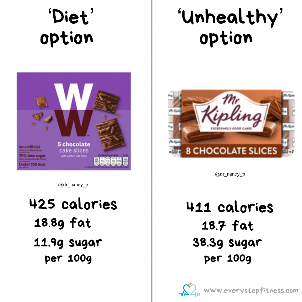 Most people would assume that the weight watchers cake bars (or other weight loss brand foods) are automatically a more virtuous choice of snack. Whilst the Mr Kipling chocolate cake slice would be considered the less healthy choice.