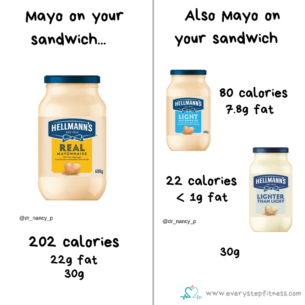 As I mentioned last week, it’s often the little things that can make a big difference when you’re trying to lose weight/ fat. Condiments often add more calories than we realise and because they’re not really seen as ‘food’ we generally overlook them when it comes to tracking calories. So swapping them to a lower calorie option is a great way to save some calories without impacting too much on the overall taste of the meal. It’s also a brilliant way to make sustainable long term changes to your diet.