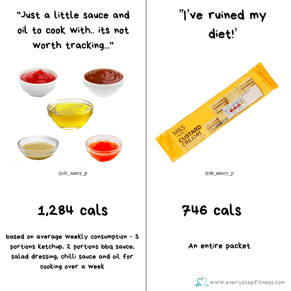 If you’re hoping to lose fat in a sustainable way you need to be aiming for a deficit of around 200-300 cals a day. Most people are pretty good at tracking the big stuff – the sandwich, the packet of crisps, the porridge for breakfast etc but how often do we overlook the little stuff. That little bit of ketchup on the side, that chilli sauce on your rice, that dash of oil in the pan…. And how often when you’re trying to lose fat do you deny yourself something you really want simply because you’re ‘on a diet’. Or how often do you feel like a failure because you’ve succumbed to the biscuits at coffee time?