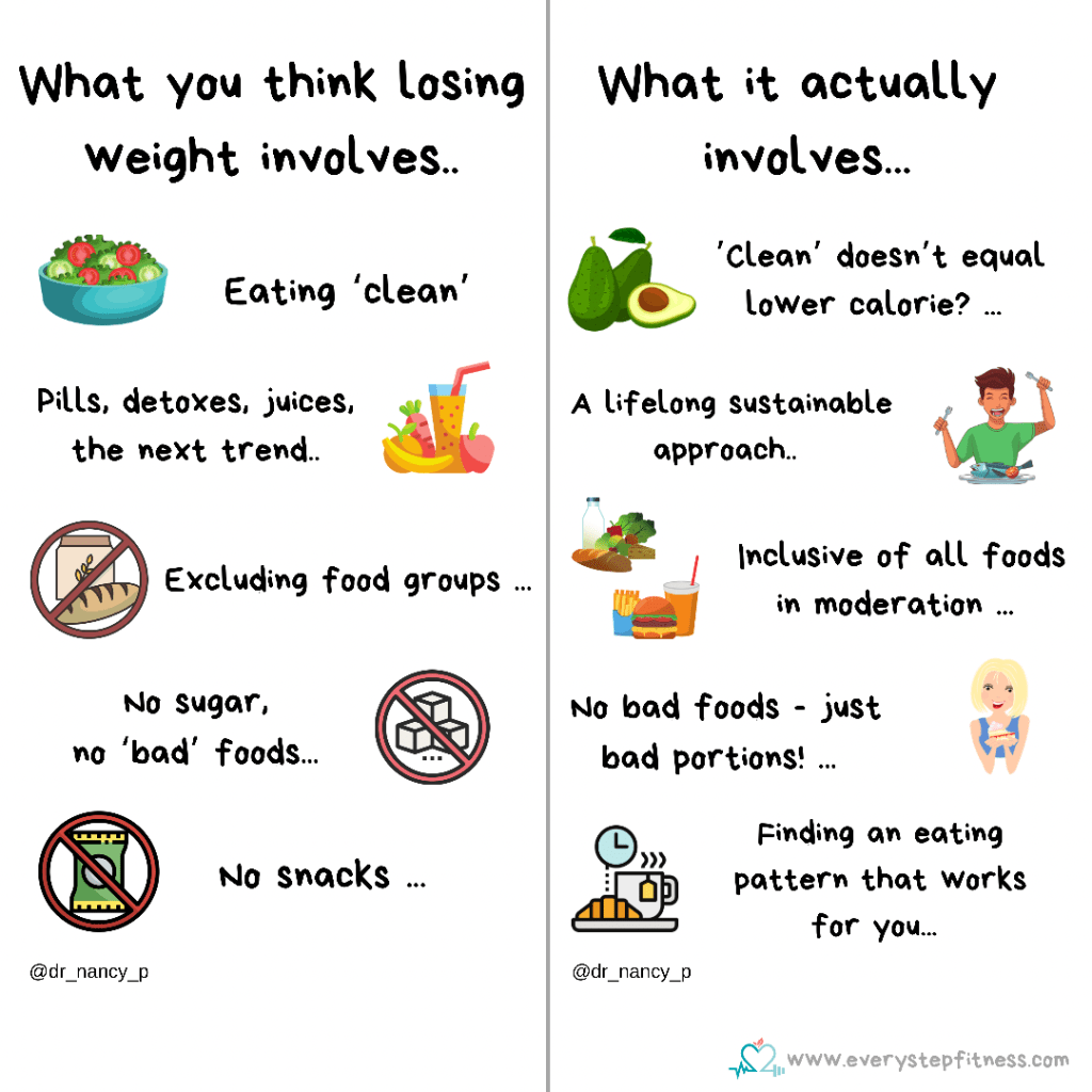 There are many misconceptions about what you need to do to lose weight or fat. You’ll hear lots of people saying you need to ‘eat clean’, cut out carbs, do a detox, have a juice cleanse, avoid sugar and bad foods, and stop snacking etc. However it’s really far more straight forward than that.
