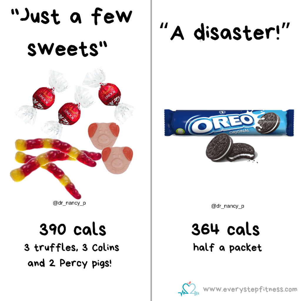 A bite here, a nibble there, just one sweet here… it’s nothing right? Yet the actual calorie impact is significant – 390 cals in this example. Whereas in contrast half a packet of Oreos would be viewed as a total disaster. One is laden with guilt, the other you barely notice. Neither is a great approach – the important thing is to be aware of the calories in what you’re eating. This means you need to consider all the little extras you might not think of as important, but equally means you need to remove the guilt from some perceived ‘disasters’ – as they’re often not as bad as you actually think!