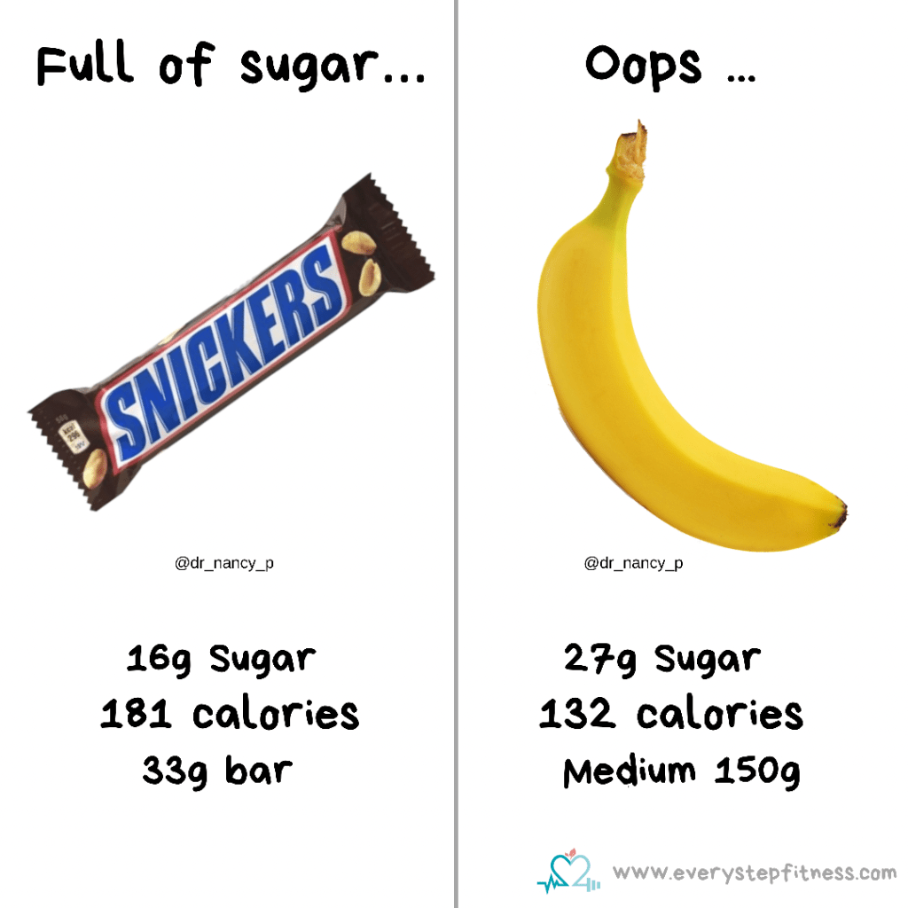 Foods also provide other things – such as pleasure, convenience etc. So if you fancy a snickers as an afternoon pick me up then go for it – as long as it fits your calorie goal for the day. If you prefer a banana than go for that! In terms of the impact on weight/fat loss there will be very little difference as long as you stay within your daily calories and are aware the snickers will be a less filling option. And in terms of sugar content the banana is actually higher.
