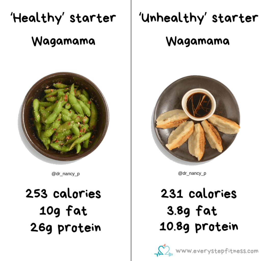 A great example of this is the classic Wagamama starter or side of edamame beans with chilli garlic salt. These yummy little beans are a popular dish and definitely a healthy choice as they’re full of nutrients. I think most people would order them thinking they were the best option calorie wise, and probably not even really think about tracking the cals (because they’re just veg right?). You’d probably munch on these without even thinking about it before you had your main starter and meal. Or you may even avoid another starter or side you actually prefer to choose these instead in the belief they’d be lower calorie.