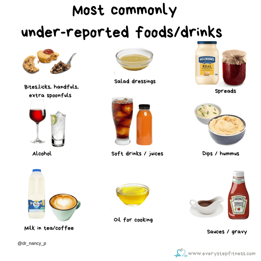In studies the most commonly under-reported foods and drinks include things like spreads, sauces, dips, gravy, salad dressings etc. All those little extras in meals seem pretty insignificant and so people often either don’t record them at all or they’ll estimate them and usually those estimates are too low. For example a scraping of mayonnaise on your lunchtime sandwich may not seem much but if you have it 3 times a week that’s still at least 300 cals, and the gravy on your Sunday roast is probably another 200 cals, whilst a drizzle of salad dressing 3 times a week is another 540 cals. That’s already an extra 1000 cals that you may not have bothered to record or have under-reported. Oil for cooking is another key area that people underestimate – a slug of oil when you cook is at least 120 cals – but most people use more than that and estimate far less.