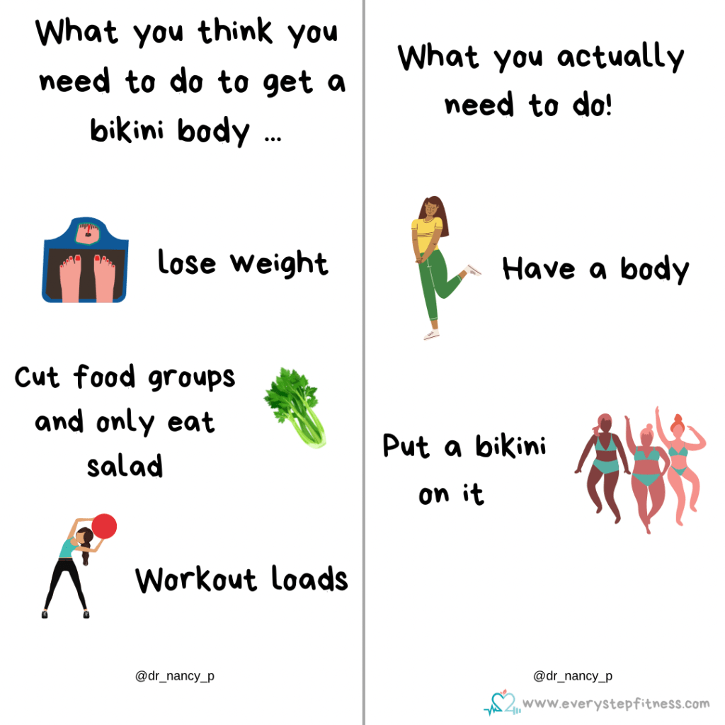 Summer holidays are here so here’s my top tip for getting a bikini body! You probably assume you need to lose weight, cut out food groups and foods you enjoy, live on salads, do loads of workouts etc…