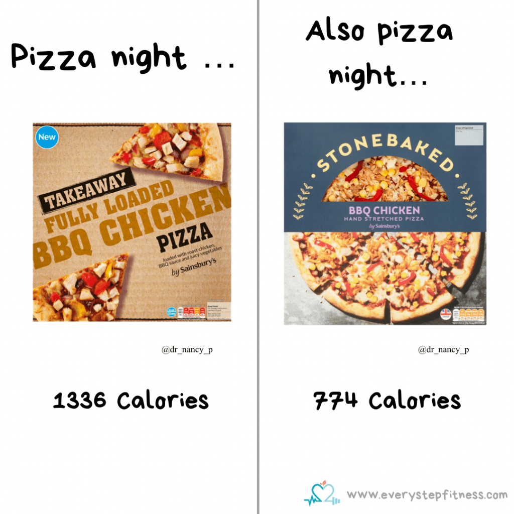 This is just one example. The standard sainsburys ‘takeaway’ BBQ chicken pizza will cost over 1300 calories! However you can get a stonebaked version for a mere 774 cals! What a bargain! And I guarantee you’ll feel just as satisfied! So if you’re trying to lose weight just consider looking for some of these lower calorie options of your favourites!