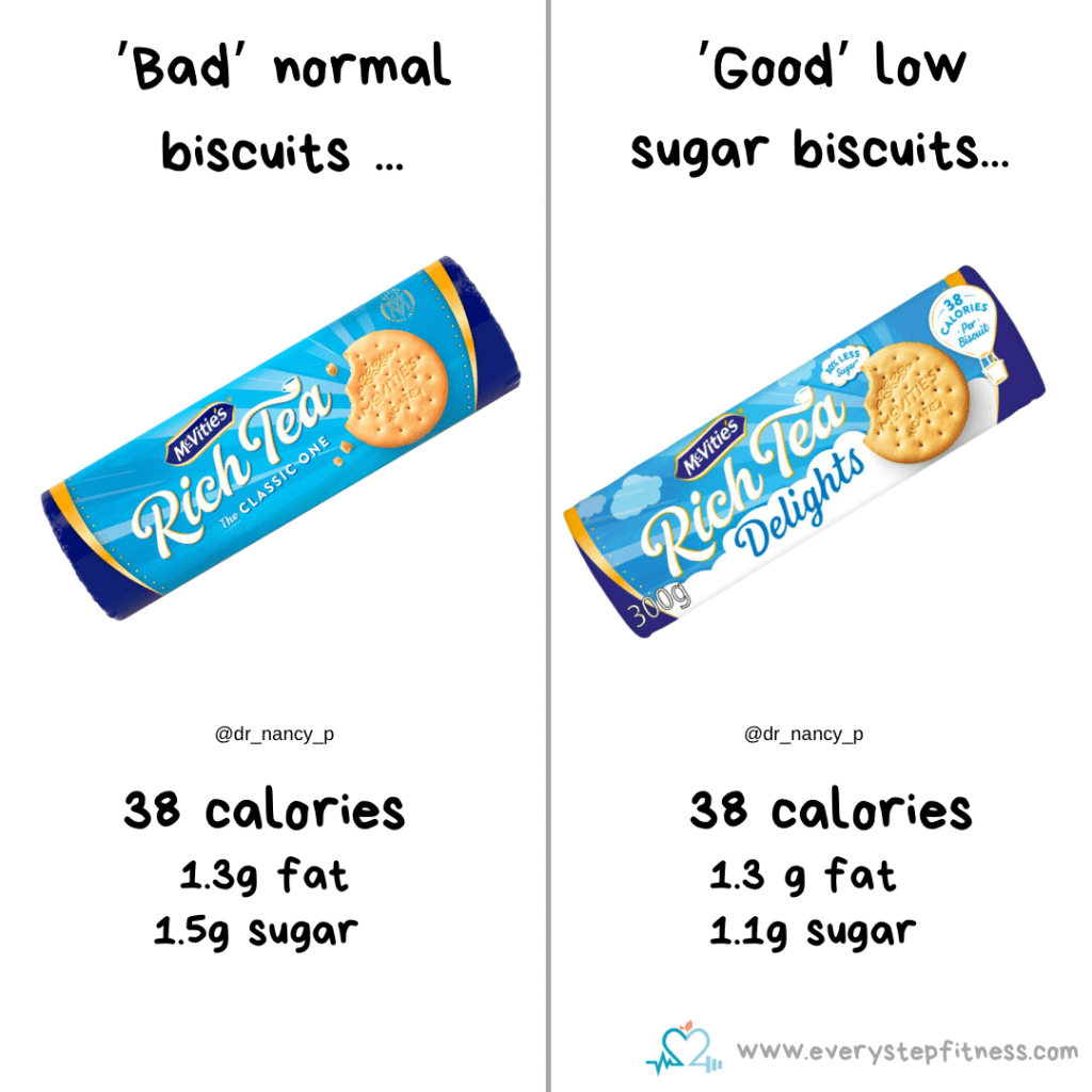 So if you’re trying to reduce your calories and are going for the reduced sugar versions of things you love just take some time to check the calories and portion sizes and see if there really is a difference. If you enjoy the reduced sugar option and it helps to keep you on track then go for it! But don’t pay more for a marketing ploy when you don’t need to. Enjoy the biscuits you like, in moderation, as part of a balanced diet 🤗