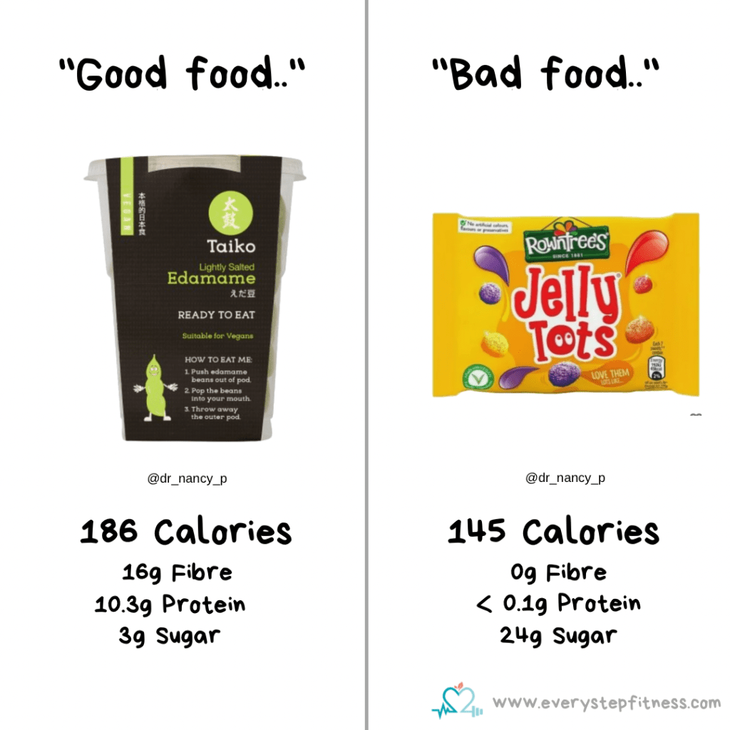 Yes edamame beans have more fibre and protein and micronutrients, whilst the jelly tots have fewer nutritional benefits. The jelly tots will provide you with some quick release energy, the edamame will keep you fuller for longer. If you were trying to hit a certain number of calories then the jelly tots may even be a better choice as they’re fewer calories but neither is inherently good or bad. They both have a place in a balanced diet. The only reason to describe either as good or bad is in terms of how you think they actually taste! And personally I think they both taste good!