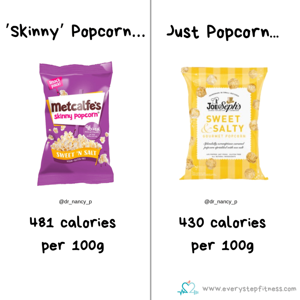 In reality the ‘gourmet’ brand in this example is actually lower in calories. The skinny popcorn comes in at 481 cals per 100g.