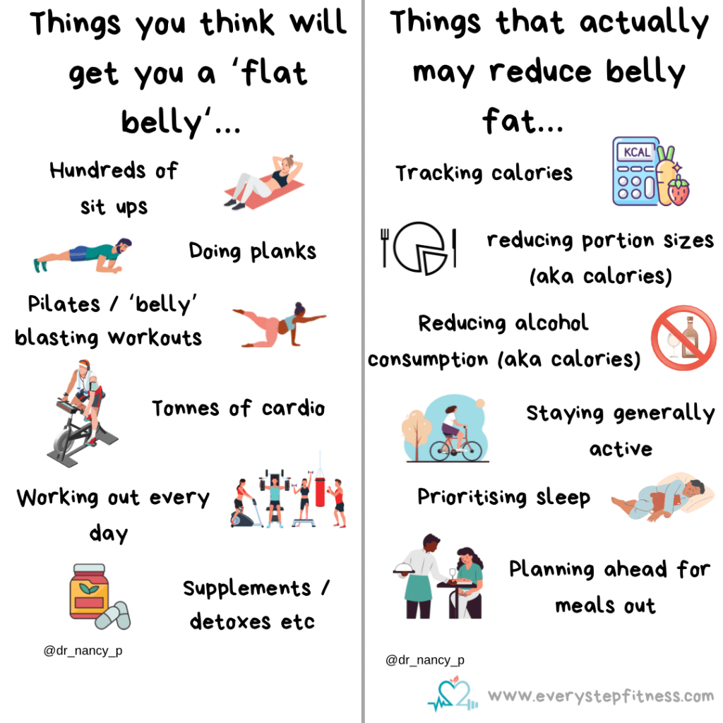 Many people want a flat stomach/visible abs and one of the most common things I’m asked is which exercises are best to achieve this. The common myth is that in order to ‘tone’ your stomach and get a flatter belly you need to do lots of abdominal exercises like sit ups or planks, do specific belly blasting workouts (you see so many of these advertised on social media) or do Pilates (or similar workouts), do a tonne of exercise., or even perhaps take some sort of belly fat blasting supplement/ tea or detox product.
