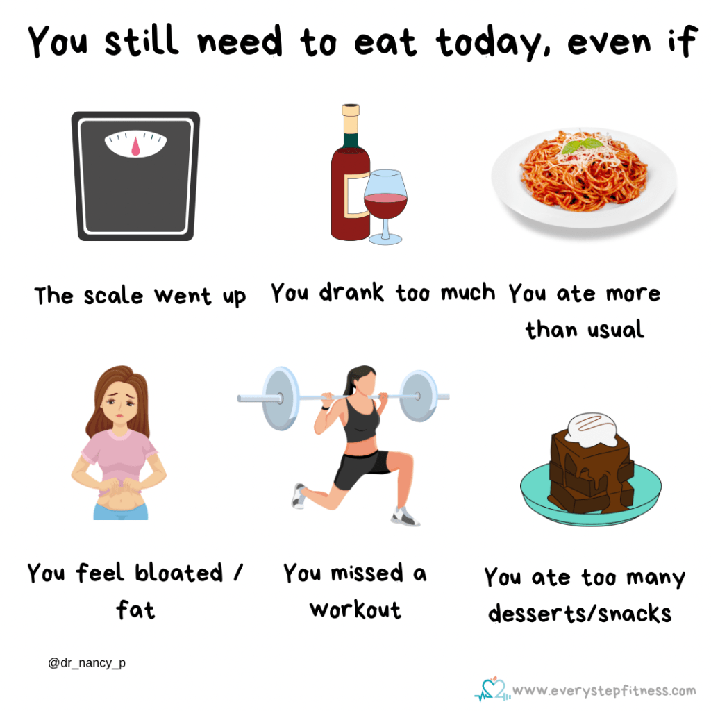 If the weekend, a holiday or yesterday or whenever didn’t go as planned you don’t need to beat yourself up. You do not need to punish yourself by starving yourself or over exercising. You still need to eat and your body still needs nourishment regardless.