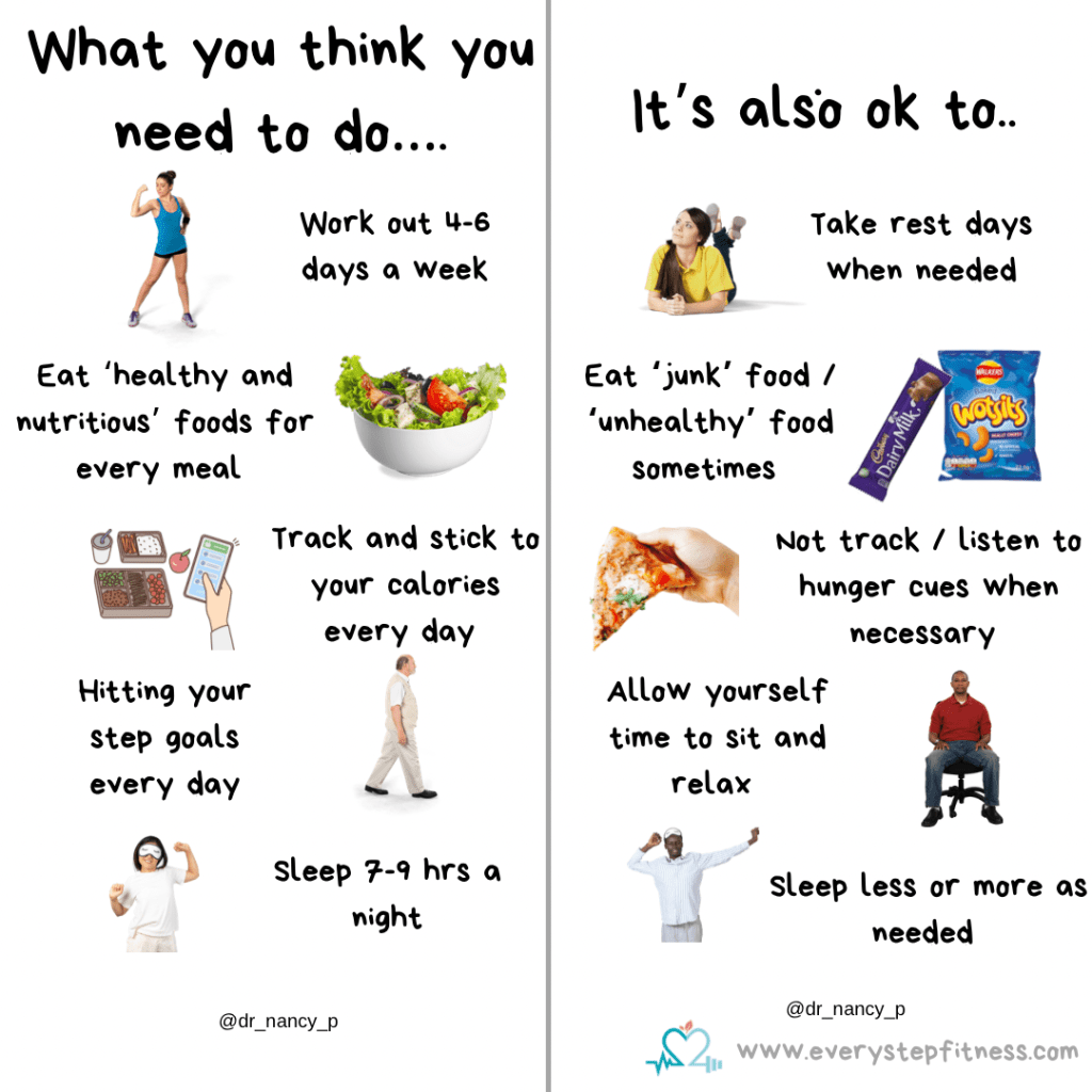 Recognise that sometimes it’s ok to indulge or to not exercise, and dial down your expectations during busy/stressful times. Practice a little self compassion and understand that progress isn’t linear and that being able to incorporate these times is actually progress itself. If you are making things too restrictive then it won’t be a long-term sustainable plan for you. Focus on consistency not perfection and with a little patience you will reach those goals.