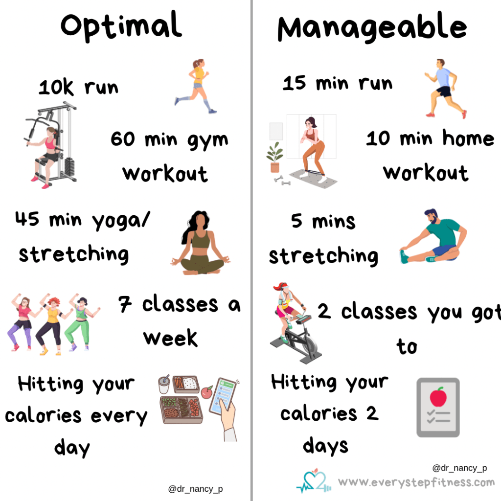 Obviously in an ideal world we’d all have an optimal workout routine – you’d manage 7 classes a week, you’d fit in 45 mins if stretching and your 10k run, and hit your calories every day. But life isn’t optimal and optimal is irrelevant if you don’t or can’t do it. Imperfect action is better than no action! The 5-10 min workout you actually do is better than the 45 min workout you don’t manage to fit in at all.