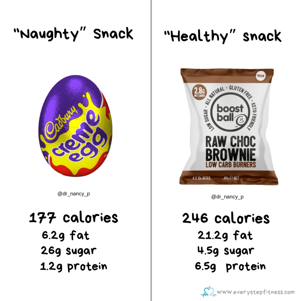 With Easter just behind us I’m hearing a lot of people saying how ‘naughty’ they’ve been or how they’ve been having lots of ‘naughty’ snacks. When you’re trying to lose fat it’s natural to try to avoid ‘junk’ food or foods high in sugar and fat. One such ‘naughty’ snack is the Cadbury creme egg. It’s chocolate so very often it’s perceived as a bad thing to be eating and is therefore accompanied by feelings of guilt and shame. But eating the boost ball is viewed as healthy and something to feel virtuous about. I mean how could it not – it’s covered in loads of ‘healthy (and often meaningless) buzz words like ‘low carb burners’ and terms that are perceived to equate to healthy/good for weight loss – raw, keto friendly, vegan, low sugar, gluten free.