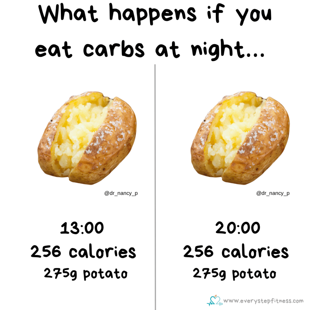 Now people tend to focus on carbs as they’re often seen as the devil and also tend to be more calorie dense (especially when you include things like cakes, biscuits, pizza, etc that technically are a combination of carbs and fat) but studies show that it makes no difference to fat storage whether your calories are from carbs or other macros. So regardless of the content of the meal if you eat a big meal at night, then yes you will probably store more fatty acids overnight as it is a high calorie meal. But as you then have a long ‘fasting’ window while you sleep you will metabolise some of them. And as long as the meals you have earlier in the day don’t take you over your calorie goal it won’t result in actual body fat gains.
