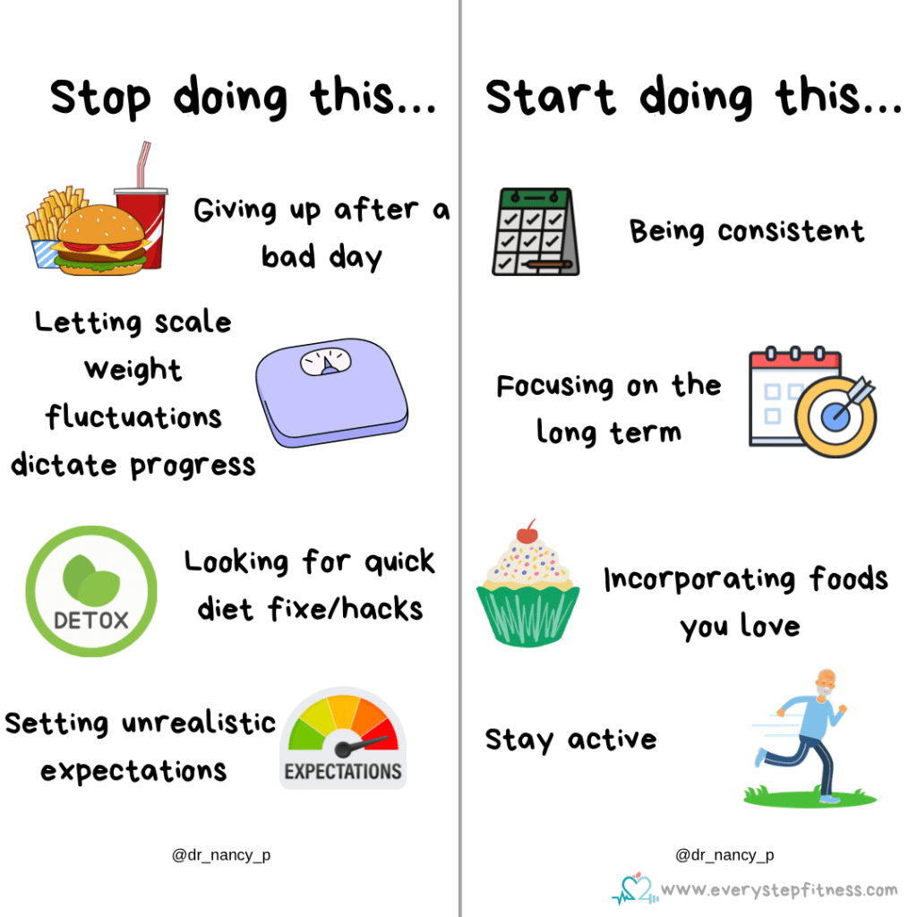It’s tempting to follow the latest diet fad, or whatever trend everyone is talking about on social media, or to cut whatever the latest ‘demon’ food group is. This won’t work – unless you learn to incorporate all the foods you enjoy in this process you’ll never succeed long term. You need to try to be as consistent as possible, stay active, and play the long game.