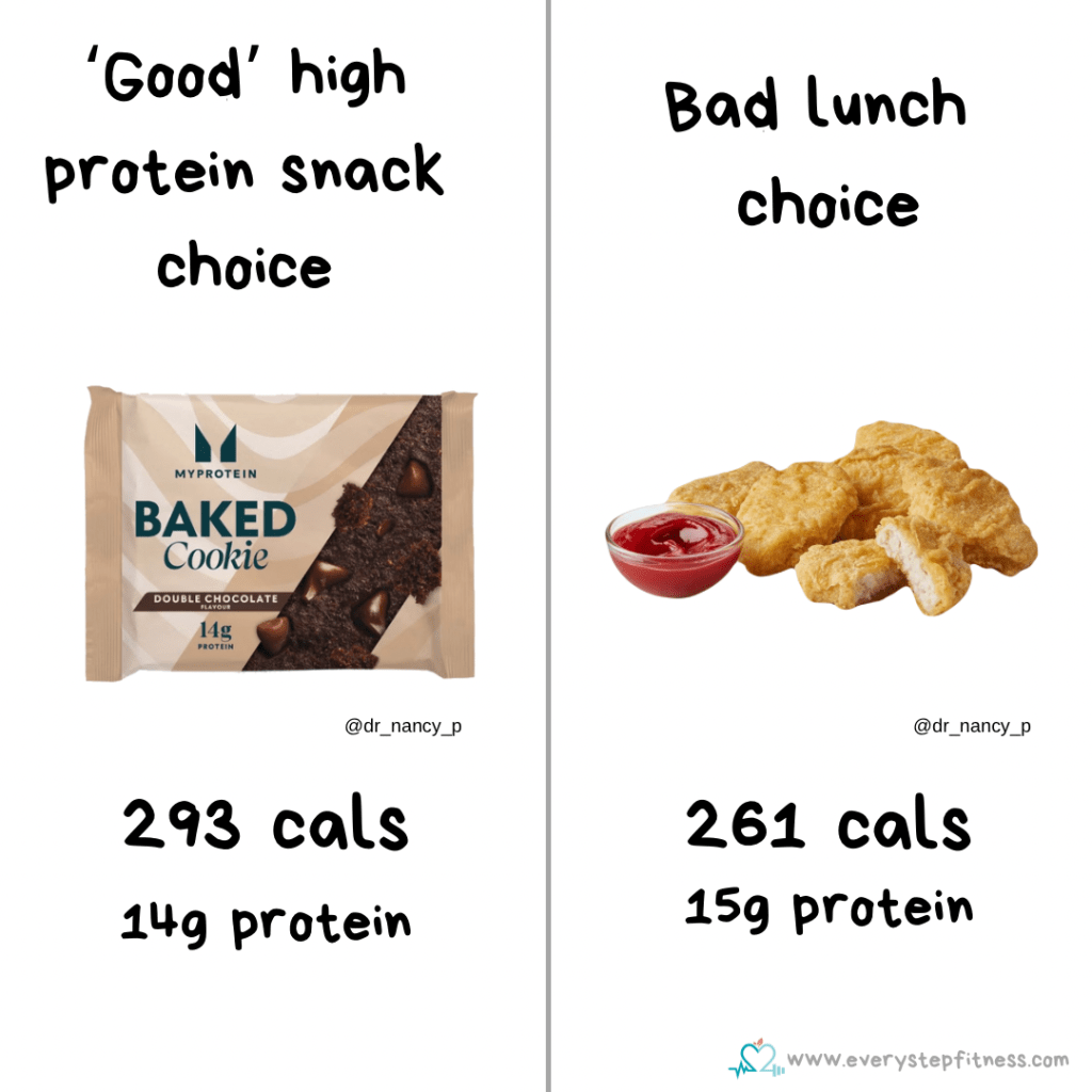 So you may well see this protein cookie and think it’s a good option. It does have a reasonable amount of protein – 14g, though that’s not that high for the calories and it’s quite a lot of calories for a snack. In contrast 6 nuggets might be perceived as a ‘bad’ lunch option, definitely not a snack, because it’s junk food isn’t it…? Yet the nuggets contain more protein (15g ) for fewer calories.
