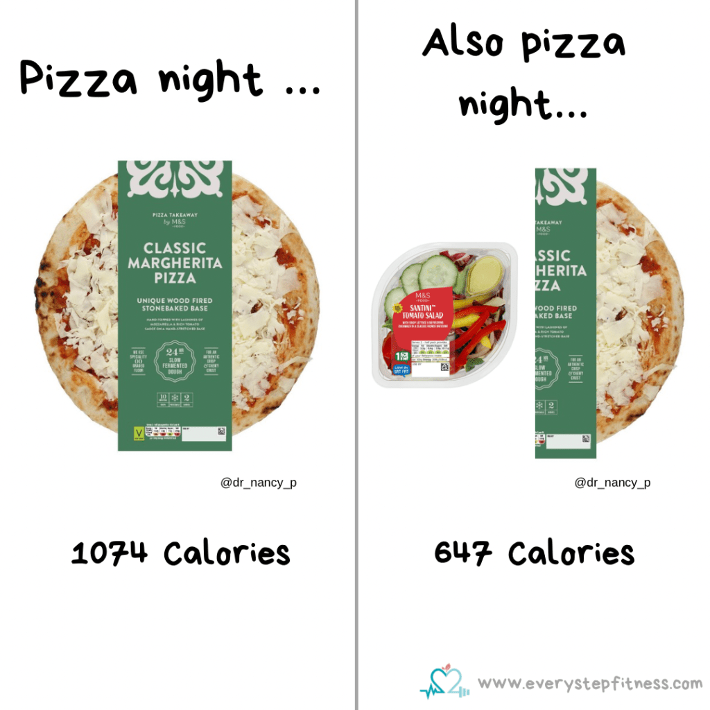 Nutrition and fat loss is always a game of trade offs. Rather than being all or nothing about it try to go for a trade off instead. Pizza nights are something many people enjoy and a pizza can be a really handy, quick and tasty meal. Pizzas are tasty but also calorie dense and low in fibre. That means it’s easy to eat a lot, and in doing so, a consume a lot of calories.