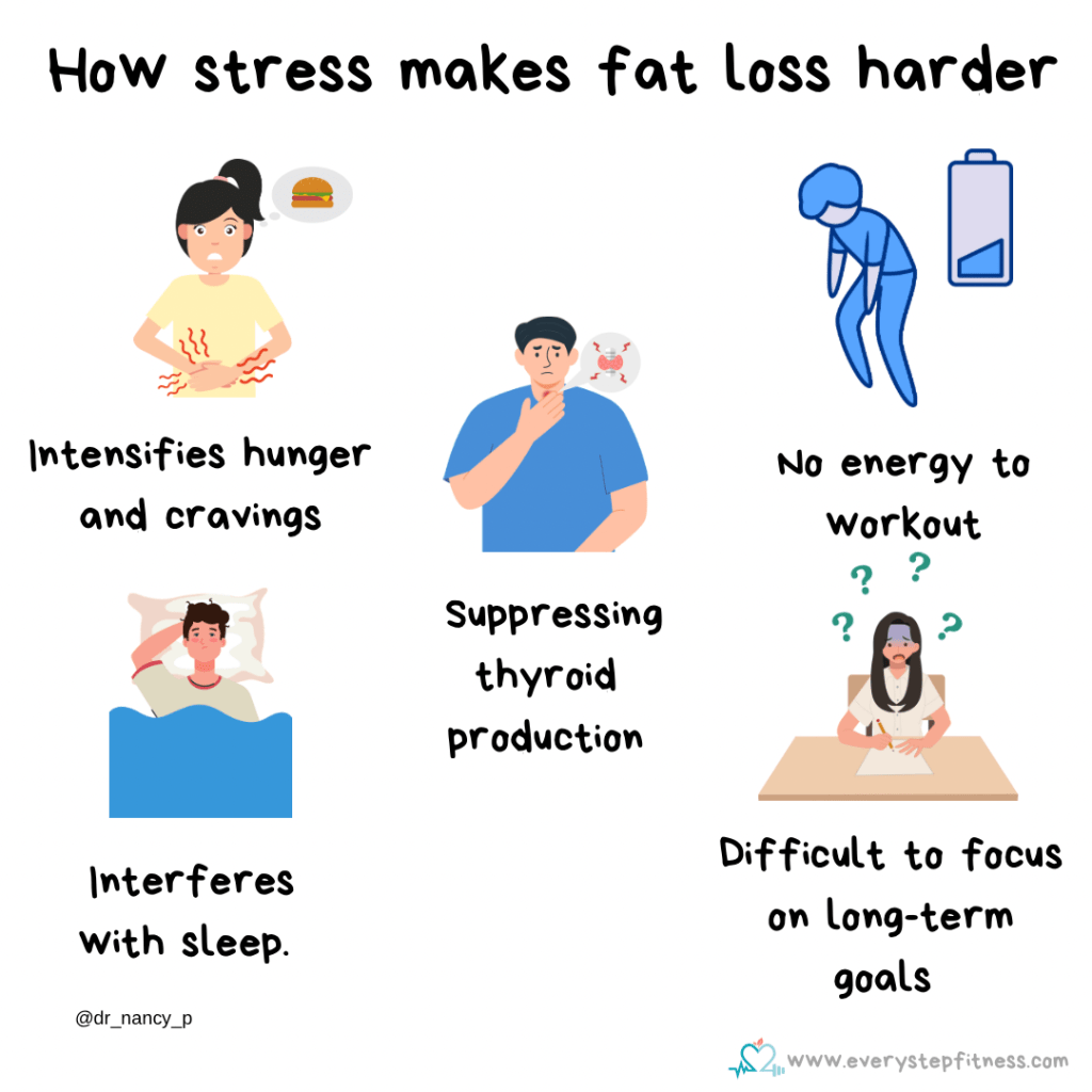 Stress also makes it harder to focus on long-term health goals. When overwhelmed, maintaining motivation becomes difficult, creating a cycle of unhealthy eating and inactivity making fat loss feel daunting and unattainable.