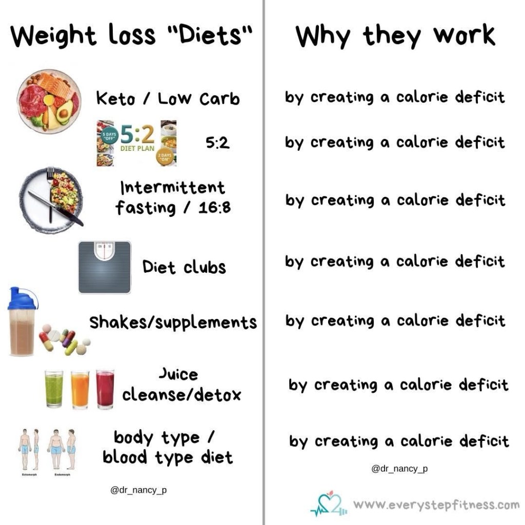 Spot the similarities? Many involve omitting food groups which will result in a calorie deficit. Calories can’t tell the time so methods involving not eating on certain days/times only work if you don’t overeat on others. Diet clubs help with accountability (regular weigh ins and rewards) but hide calories behind points or labels which lock you in to their method.