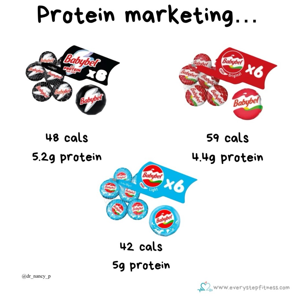 This is a great example – three types of Babybel. All small, all cheese, all decent snacks, but one is branded ‘High Protein’ with bold black packaging. So it must be the healthiest and best right?