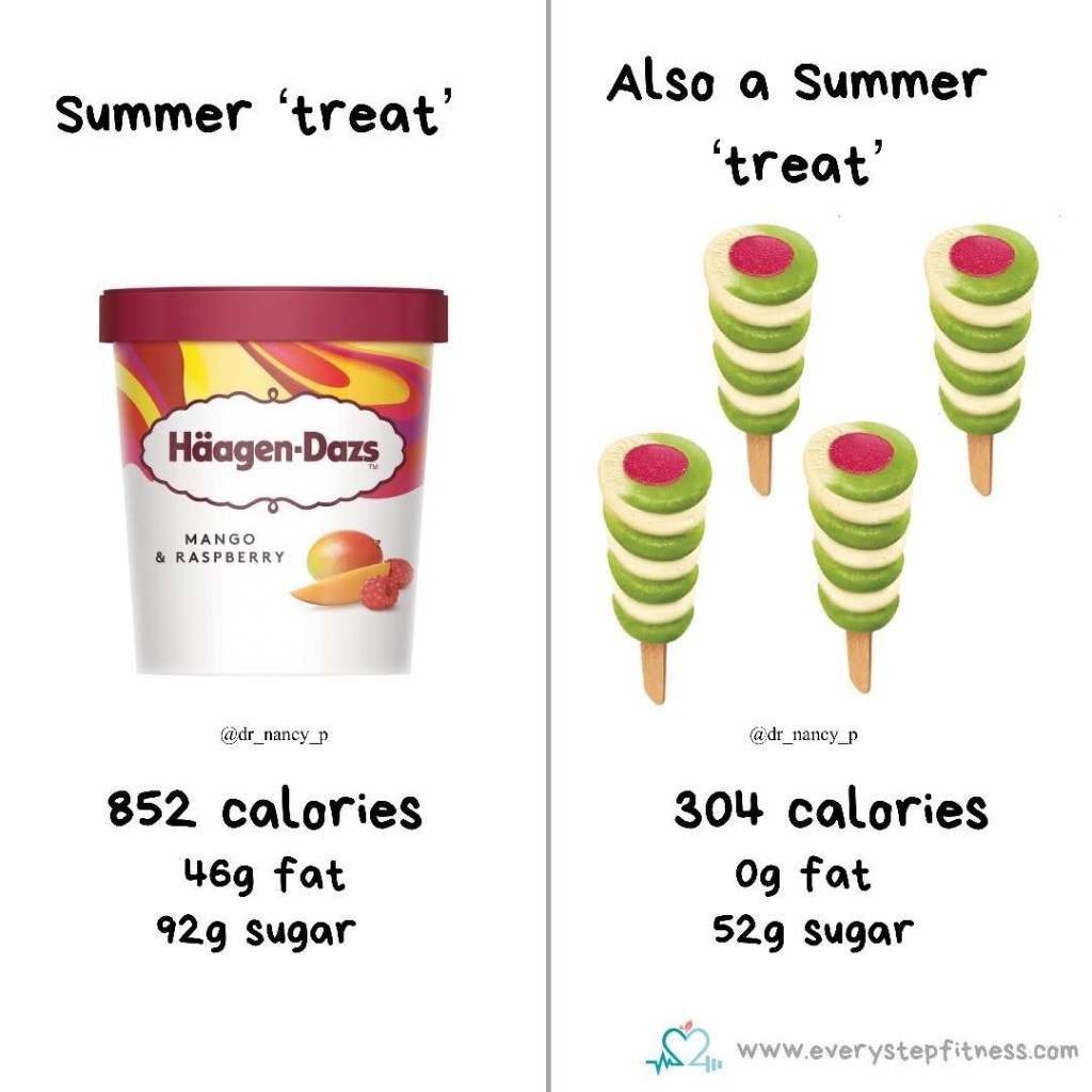 In this example switching from the Häagen-Dazs mango and raspberry ice cream to twisters makes a massive calorie saving. You could have 4 twisters for almost a third of the calories of the Häagen-Dazs. As an added bonus the chances of you eating 4 twisters in a row is considerably less than working your way through a tub anyway. Psychologically it’s much easier to work your way through an open tub than help yourself to 4 lollies in a row.