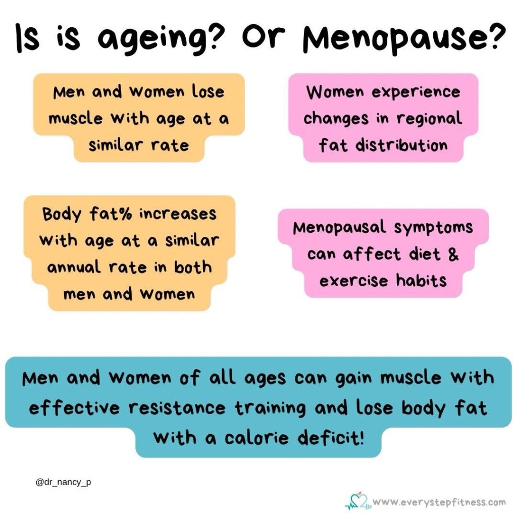 The top trendy topic at the moment on social media is menopause. There’s a strong tendency to blame changes in body composition — losing muscle, gaining fat, feeling ‘different’ in your body on menopause. And it’s completely understandable. It’s a big life transition, symptoms can be tough, and your body may not respond the way it once did. But how much of this is due to menopause and how much is just ageing which affects men and women? Why does it matter? Because people are preying on menopausal women and selling magic supplements and training programs as a way to make money.