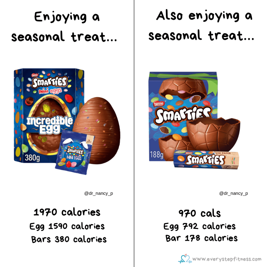 In contrast you could enjoy a large Smarties egg and the tube of smarties for around 1000 cals. Now ok, the egg is just a milk choc egg (not full of bits like the giant one) but it’s still delicious and that’s still almost a whole day’s calories for many people.