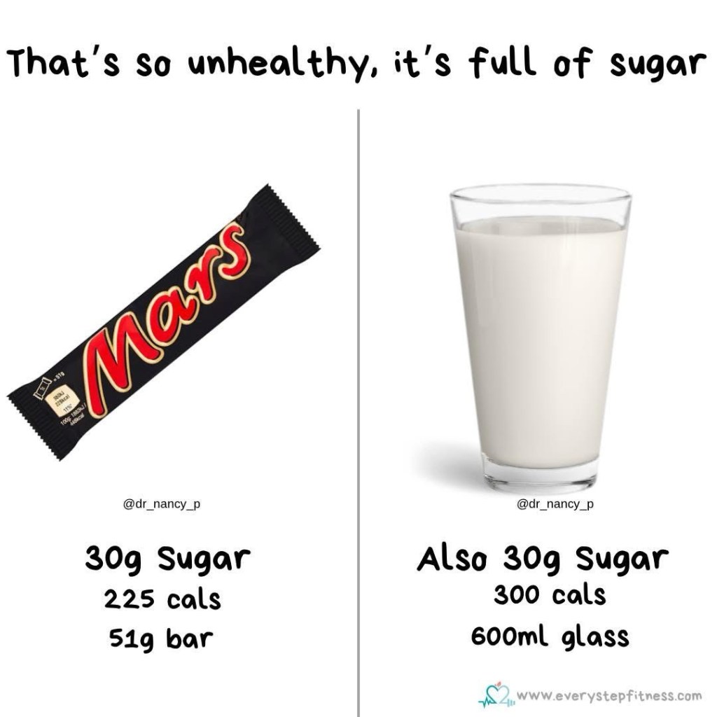 A mars bar contains around 30g sugar and a 600ml glass of milk also contains 30g sugar. However people will demonise the chocolate bar on the basis of its sugar content but will say milk is the ‘healthier’ choice, despite the sugar content? Why? Because the sugar in milk is ‘natural’ so it must be better, right?