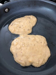 The batter will be lumpy – that’s fine too! Heat a little oil in a pan and then add the batter. Leave to cook on one side, then flip.