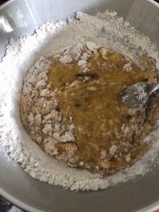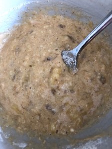 The mixture will vary in consistency depending on your banana size and ripeness, and egg size – it really doesn’t matter though. Add the flour and cinnamon and mix well.
