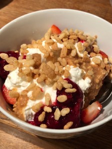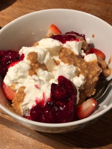 Add the dollop of greek yoghurt and drizzle the peanut butter over. If you’ve got any stewed fruit then add a dollop – I cooked up a batch of apple, red currant and blackberries which is great to add to desserts and porridge etc.