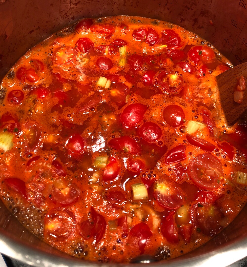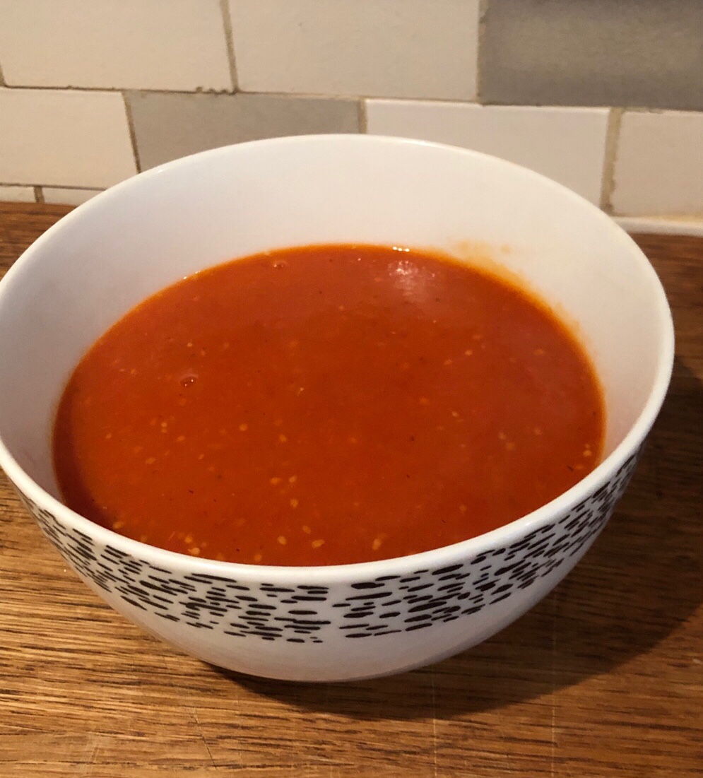 Depending how much liquid the tomatoes produced you may want to keep boiling a little longer to reduce it down – you can decide how thick you want your soup. (You can also add a little cornflour – mix a couple of tbsp in a bowl with cold water and then whisk that into the soup to thicken it).