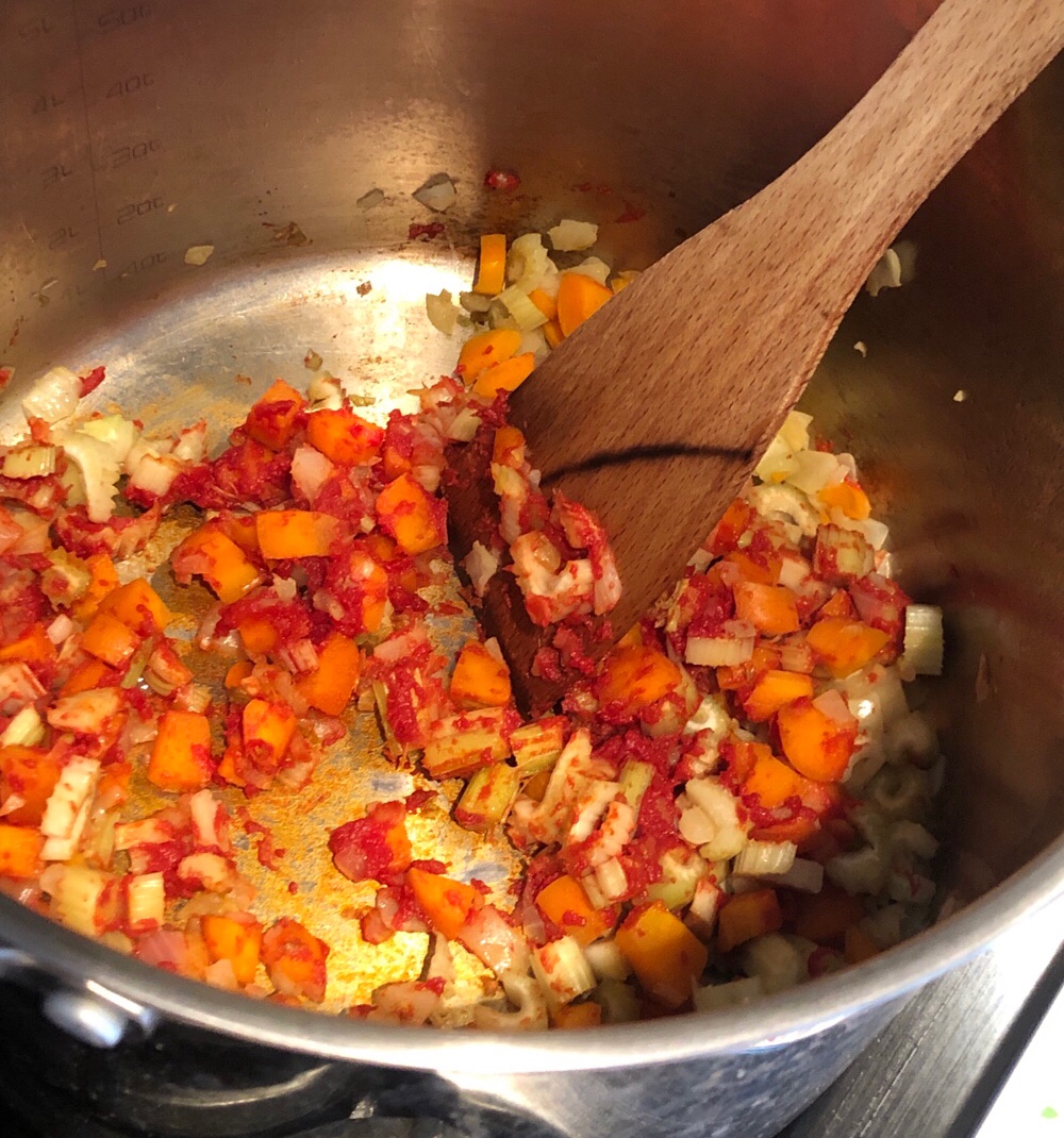 Add some oil or oil spray to a large saucepan and once hot add the onions, celery and carrots. Sauté them for around ten minutes until soft and slightly coloured.