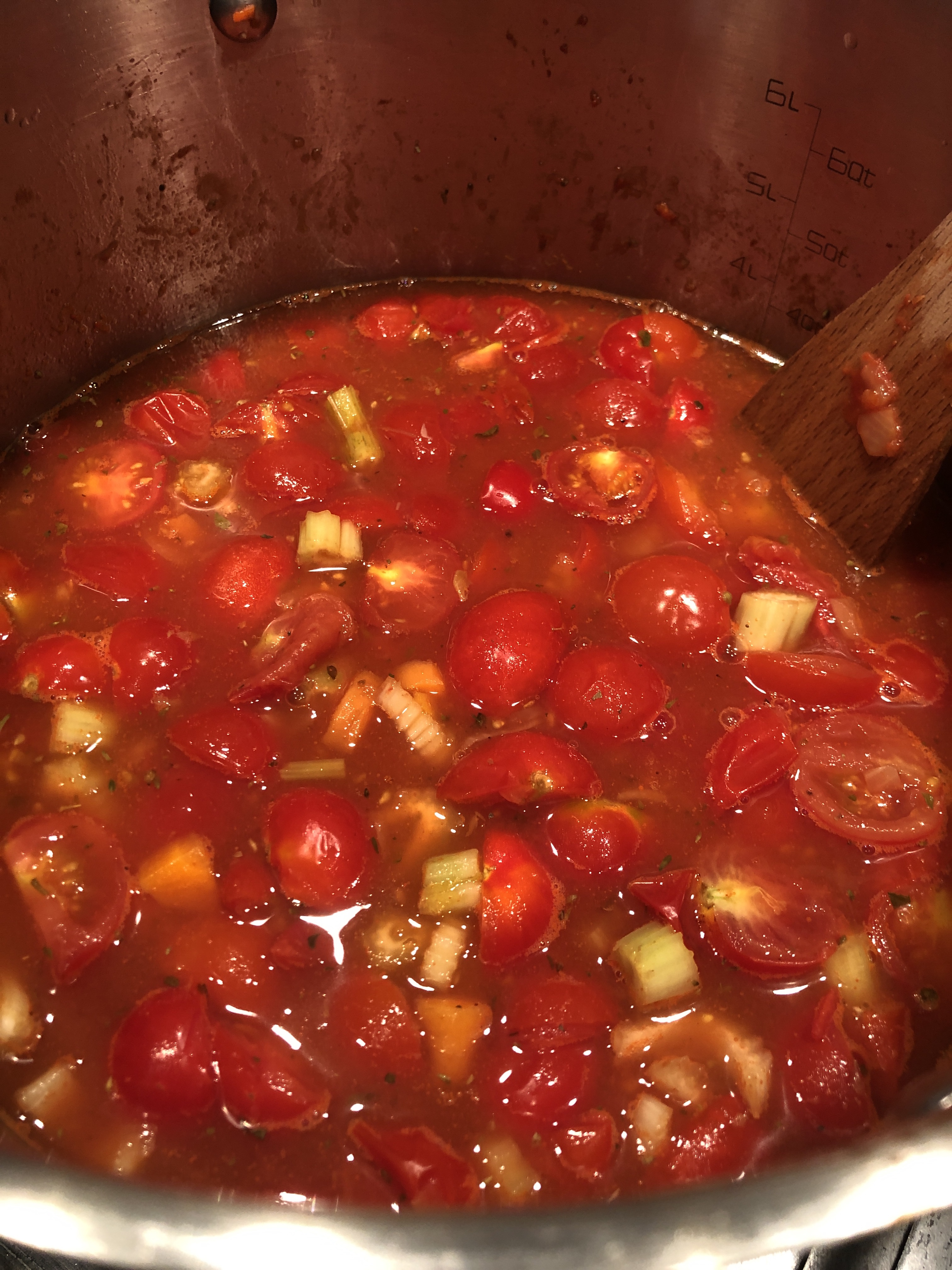 Chop the onion, carrot and celery into small pieces. Depending on the size of the tomatoes cut them into halves or quarters.