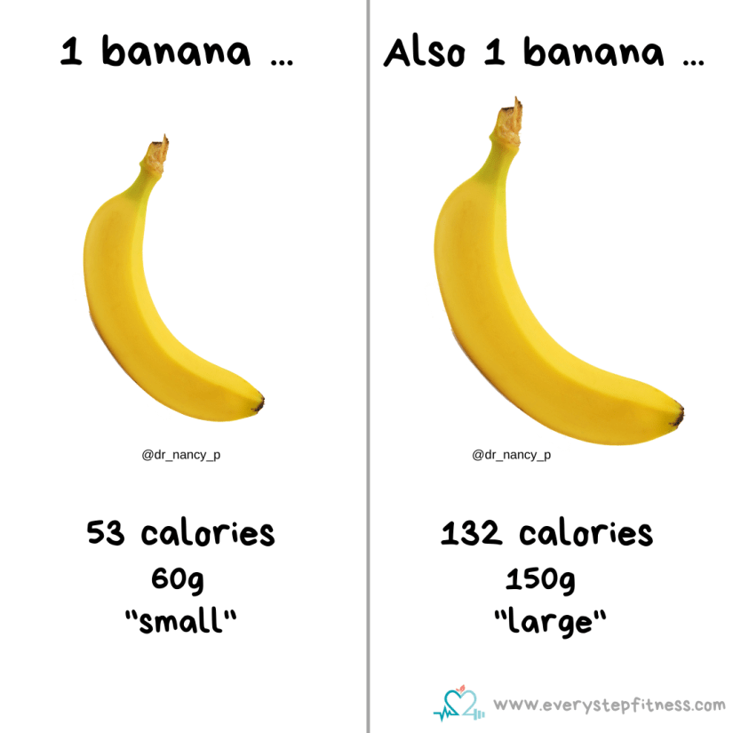 The difference between these two bananas is nearly 100g and both are sold as ‘bananas’ – not small or large. So if you were regularly snacking on the larger one you’d be taking in almost 80 extra calories every time. That may not sound like much but over the course of a week or month that will add up. I’m not suggesting you stop having bananas – they’re fab! But just have a go at weighing the next banana you have and see exactly how many calories it does contain.